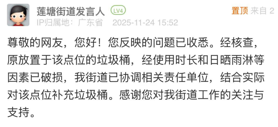 案例點(diǎn)評(píng):針對(duì)市民反映“垃圾桶無(wú)故取消”的問(wèn)題,街道辦在3小時(shí)內(nèi)完成核查,清晰說(shuō)明垃圾桶搬離原因,同時(shí)迅速協(xié)調(diào)相關(guān)責(zé)任單位,結(jié)合實(shí)際情況明確將為該點(diǎn)位補(bǔ)充垃圾桶,切實(shí)解決群眾投放垃圾的剛需。此次處置迅速有效,既體現(xiàn)了直面民生訴求、不推諉不拖延的工作態(tài)度,也展現(xiàn)了精細(xì)化治理能力,為后續(xù)環(huán)衛(wèi)設(shè)施維護(hù)和民生需求響應(yīng)提供了范本。
