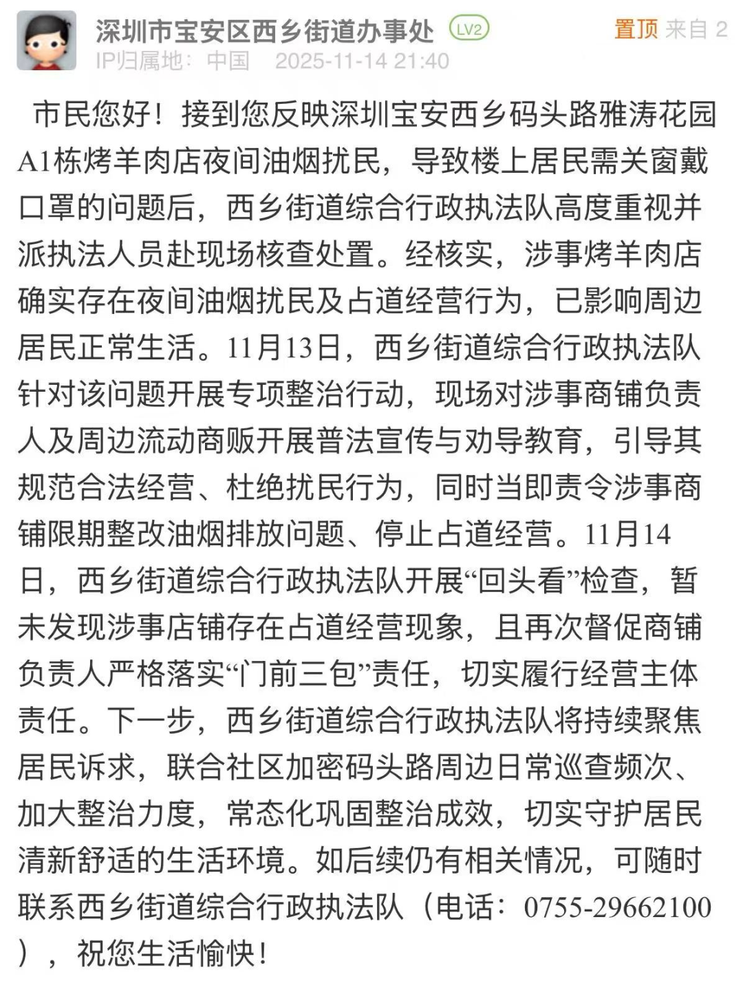案例點評:接到市民反映后,街道迅速響應(yīng),當(dāng)日開展核查,次日回應(yīng)進(jìn)展,處置高效。針對涉事店鋪油煙問題,執(zhí)法隊不僅現(xiàn)場開展普法勸導(dǎo),責(zé)令商鋪限期整改,更在次日開展“回頭看”檢查,及時跟進(jìn)整改進(jìn)度、壓實經(jīng)營主體責(zé)任?;貞?yīng)中,街道明確下一步將聯(lián)合社區(qū)加密日常巡查、加大整治力度,常態(tài)化鞏固整治成效,體現(xiàn)出緊盯民生痛點、深耕基層精細(xì)化治理、全力守護(hù)居民舒適生活環(huán)境的決心。