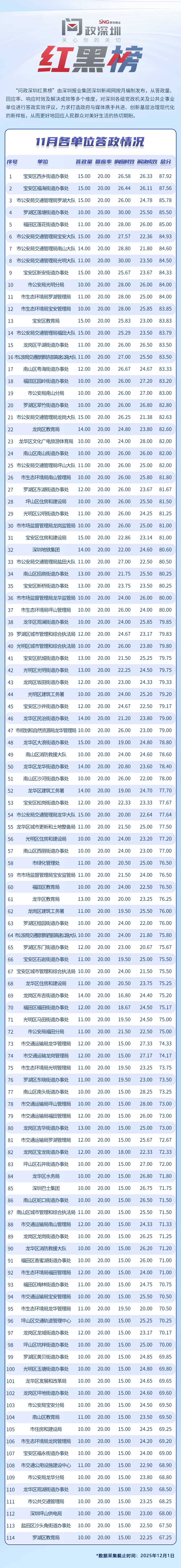 為探尋媒體如何精準(zhǔn)賦能基層治理現(xiàn)代化的“深圳路徑”,深圳報業(yè)集團(tuán)正式掛牌成立“問政深圳”工作室,旨在進(jìn)一步推動網(wǎng)絡(luò)問政工作的高效開展。為確保相關(guān)工作更加契合實際需求,深圳報業(yè)集團(tuán)深圳新聞網(wǎng)按照“最快速度辦結(jié)”的總體要求,將原有月度榜單創(chuàng)新升級為“問政深圳紅黑榜”,并對評分體系進(jìn)行了細(xì)致優(yōu)化。該榜單從答政量、回應(yīng)率、響應(yīng)時效及解決成效等多個維度,對深圳各級黨政機(jī)關(guān)及公共企事業(yè)單位進(jìn)行答政實效評議,力求打造政府與媒體攜手共進(jìn)、創(chuàng)新基層治理現(xiàn)代化的新樣板,從而更好地回應(yīng)人民群眾對美好生活的熱切期盼。